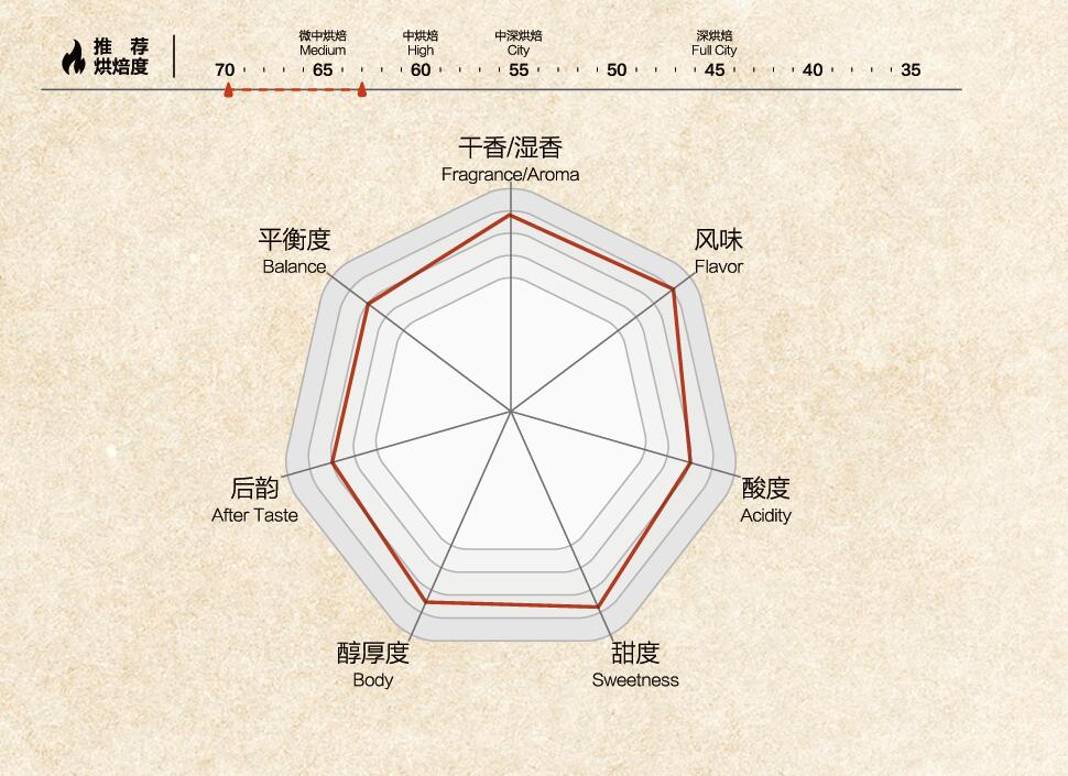 花香(Floral) 樹莓(Raspberry) 檸檬草(Lemongrass) 柑橘(Cirtus) 余韻悠長(Lone Aftertaste) 烘焙度:Medium 70~63 |
